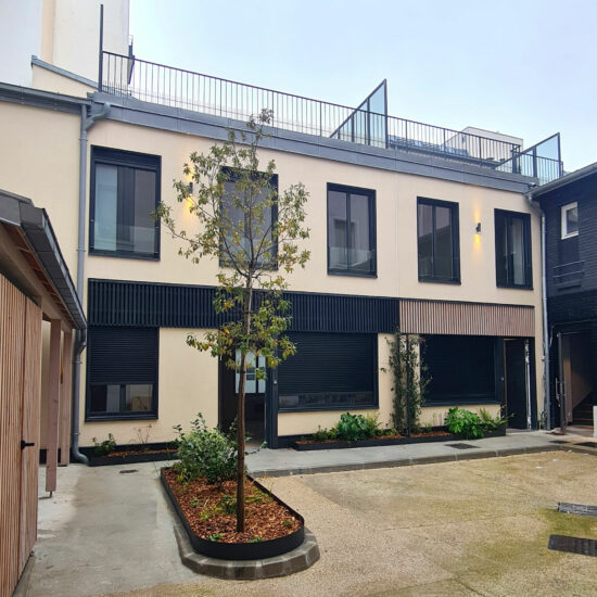 Les bâtiments en cœur d'llot sont organisés en lanières perpendiculaires au passage, et offrent I ‘image de grandes maisons de ville mitoyennes assemblées en petites rangées, accueillant en réalité des logements intermédiaires superposes deux a deux (et exceptionnellement superposant trois logements), de façon à minimiser les parties communes, en référence au logement individuel dense. Ces constructions pourraient être réalisées en bois, en alternant des parements de façade en bardage bois et en enduit a Ia chaux. Les soubassements le long de Ia venelle restent en pierre, dans Ia continuité des soubassements des immeubles sur rue, mais réalises avec de Ia pierre de récupération (éventuellement issue de Ia déconstruction des immeubles actuels, ou de filières de réemploi mobilisables sur le territoire de Plaine Commune) sur une assise en pierre taillée, ce qui fabrique une ambiance plus bucolique qui fait corps avec les aménagements des espaces extérieurs jardines. Les constructions en plâtre évoquent les anciennes "maisons en plâtre" caractéristiques de l'histoire maraichère des lieux, et dont un témoignage subsiste aux n° 68 et 70 de Ia rue Heurtault. Les toits en zinc fabriquent une silhouette qui se découpe dans le ciel et contribue également à évoquer une échelle urbaine intermédiaire de faubourg, dans Ia continuité historique des lieux.